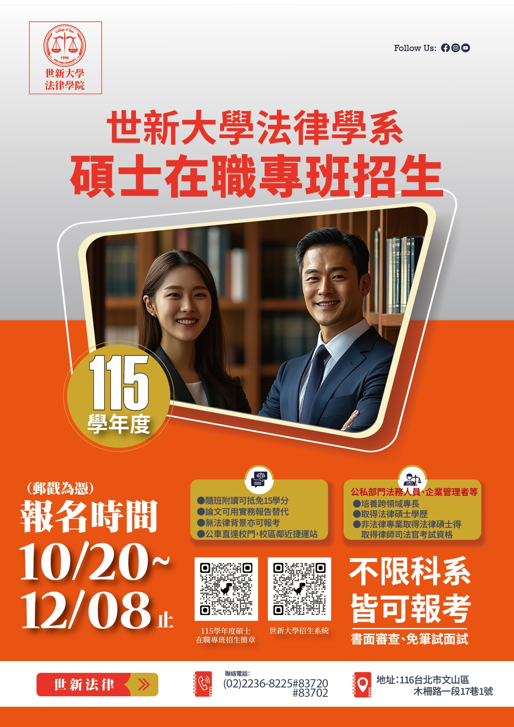 世新大學法律系碩士在職專班線上招生說明會,歡迎蒞臨參與 2025-11-05 世新大學法律學系碩專班 線上招生說明會 為增進您對於世新大學法律學系碩士在職專班的了解, 特安排線上招生說明會,歡迎您的參加。 報名網址 說明會網址 活動時間:114年11月12日(週三)19:00 活動流程如下: 1.系所介紹、環境介紹 2.師資介紹 3.畢業規定及授課時間及紹 4.Q&A ~更多世新大學法律碩專班~ Category: 近期活動