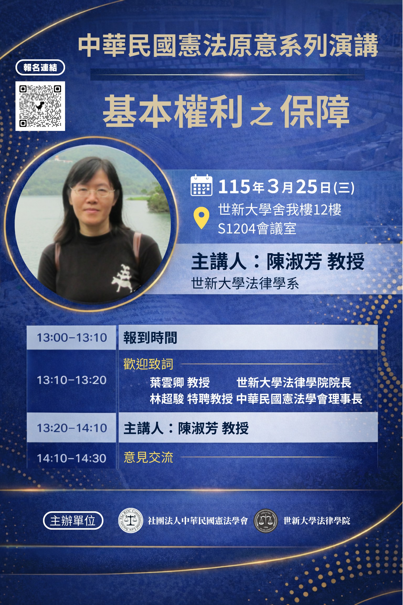 本次活動我們非常榮幸邀請到世新大學法律學系的 陳淑芳教授,為我們深入剖析中華民國憲法的原意,帶領大家探討與你我息息相關的「基本權利之保障」。無論您是對法學領域有濃厚興趣,還是關心自身權益,這都將是一場不容錯過的精彩學術饗宴!