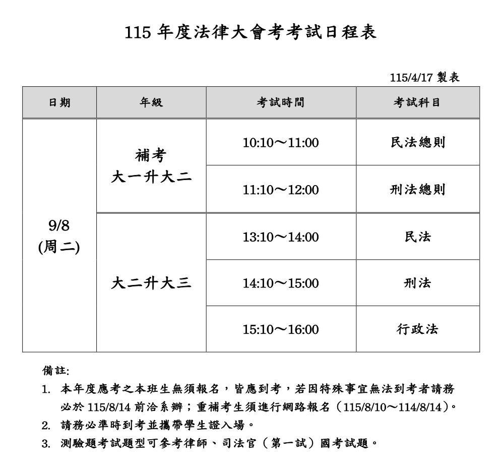 - 本年度應考之本班生無須報名,皆應到考,若因特殊事宜無法到考者請務必於115/8/14前洽系辦;重補考生須進行網路報名(115/8/10~114/8/14)。