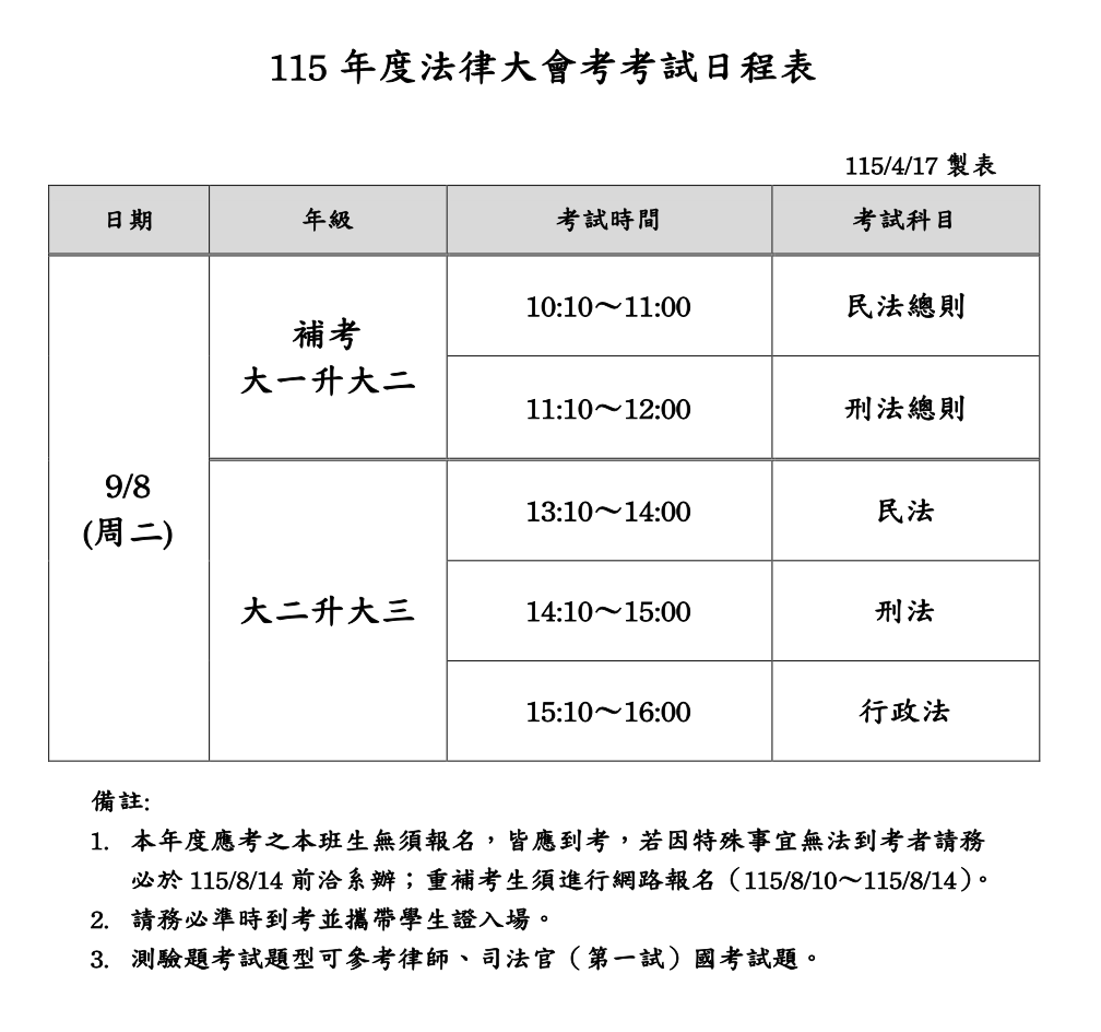 【公告】115年度法律大會考考試日程表